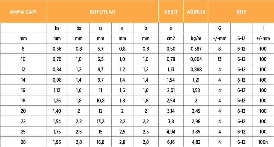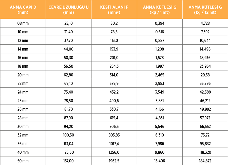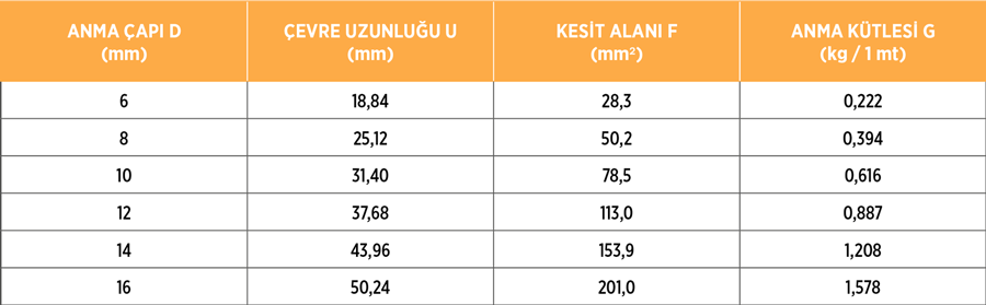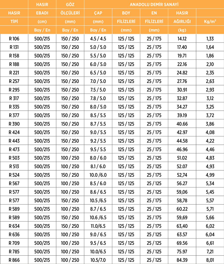 R Tipi Çelik Hasır Ağırlık Tablosu