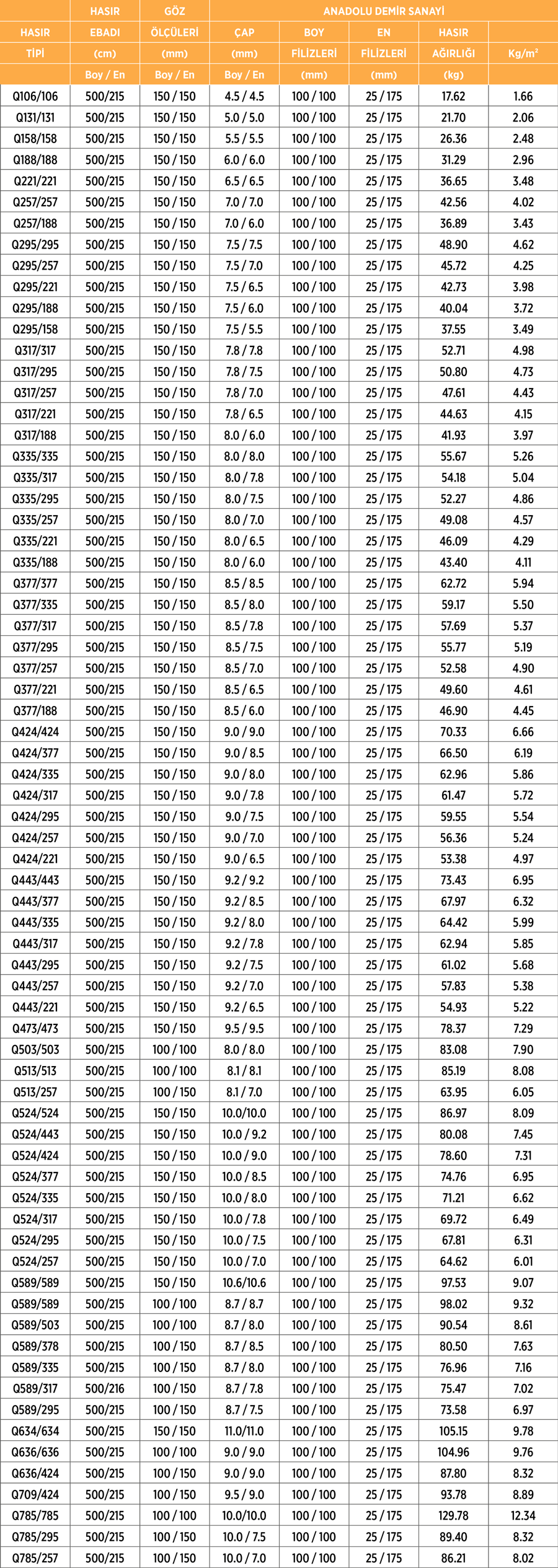 Q Tipi Çelik Hasır Ağırlık Tablosu